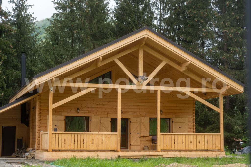 Cabana familiala din grinzi dublu profilate in sectiune 100/200 mm, dublaj interior in structura lemn cu izolatie vata bazaltica 100 mm, finisaj interior in lambriu grosime 21 mm, latime 150 mm, cu amprenta la sol de de 7,52×7,84 m, excelent compartimentata pentru vacanta in familie.