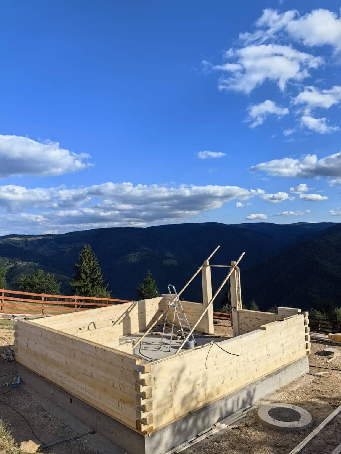 Pereții exteriori sunt realizați din grinzi masive de rășinoase, dublu profilate, îmbinate la colțuri în sistem „coadă de rândunică”, pentru o etanșare perfectă și un aspect autentic. Grinzile sunt montate cu sisteme de compensare a tasării lemnului, asigurând stabilitate și durabilitate în timp.