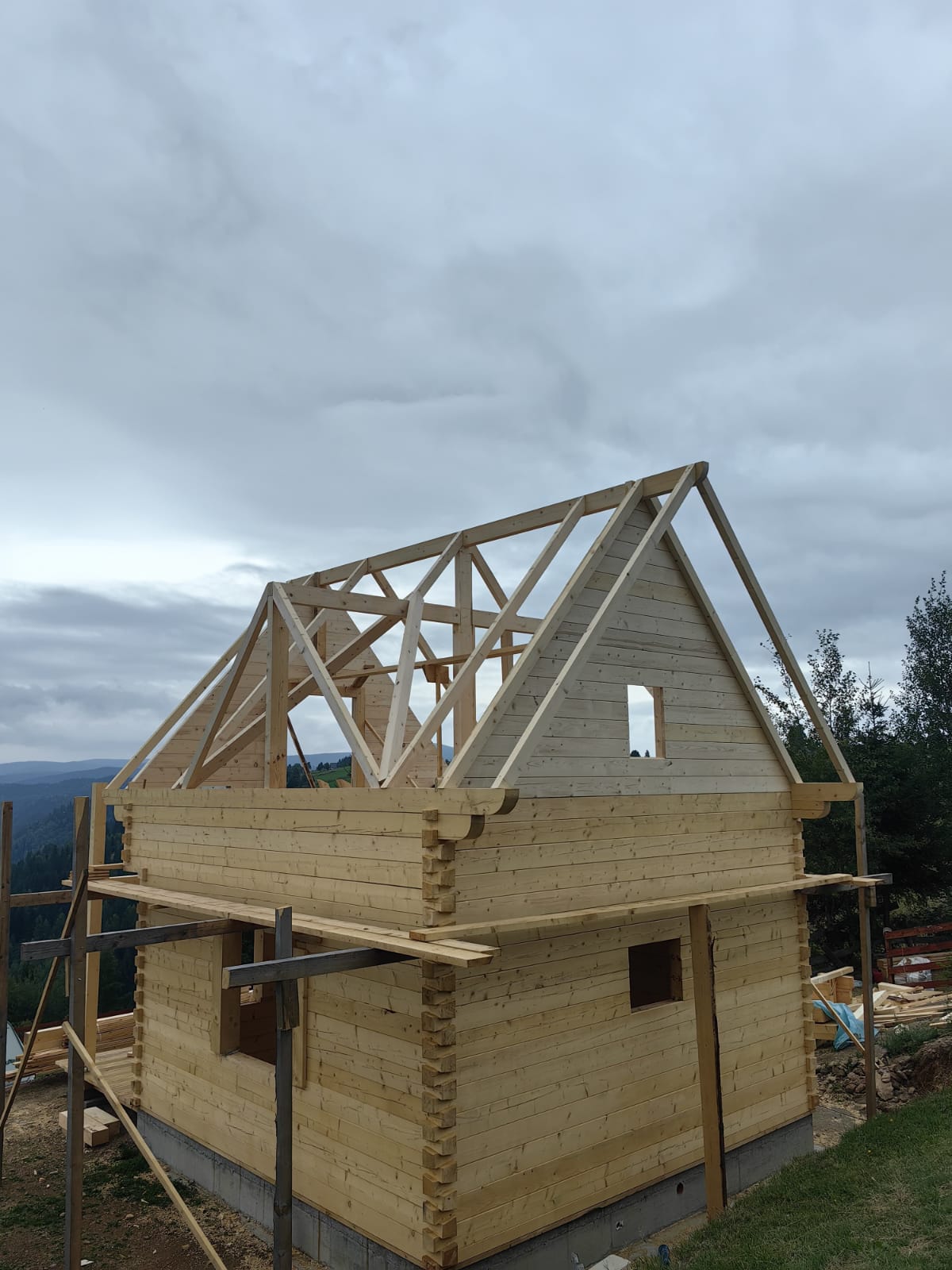 Casă de vacanță din grinzi de lemn masiv esență rășinoase, dublu profilate, în secțiune 150/200 mm, cu suprafața construită de 63,25 m², excelent compartimentată pentru o familie.