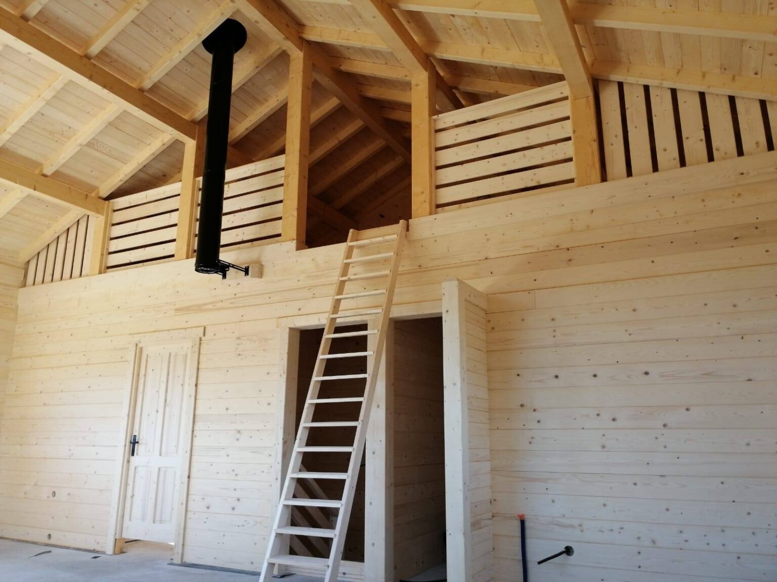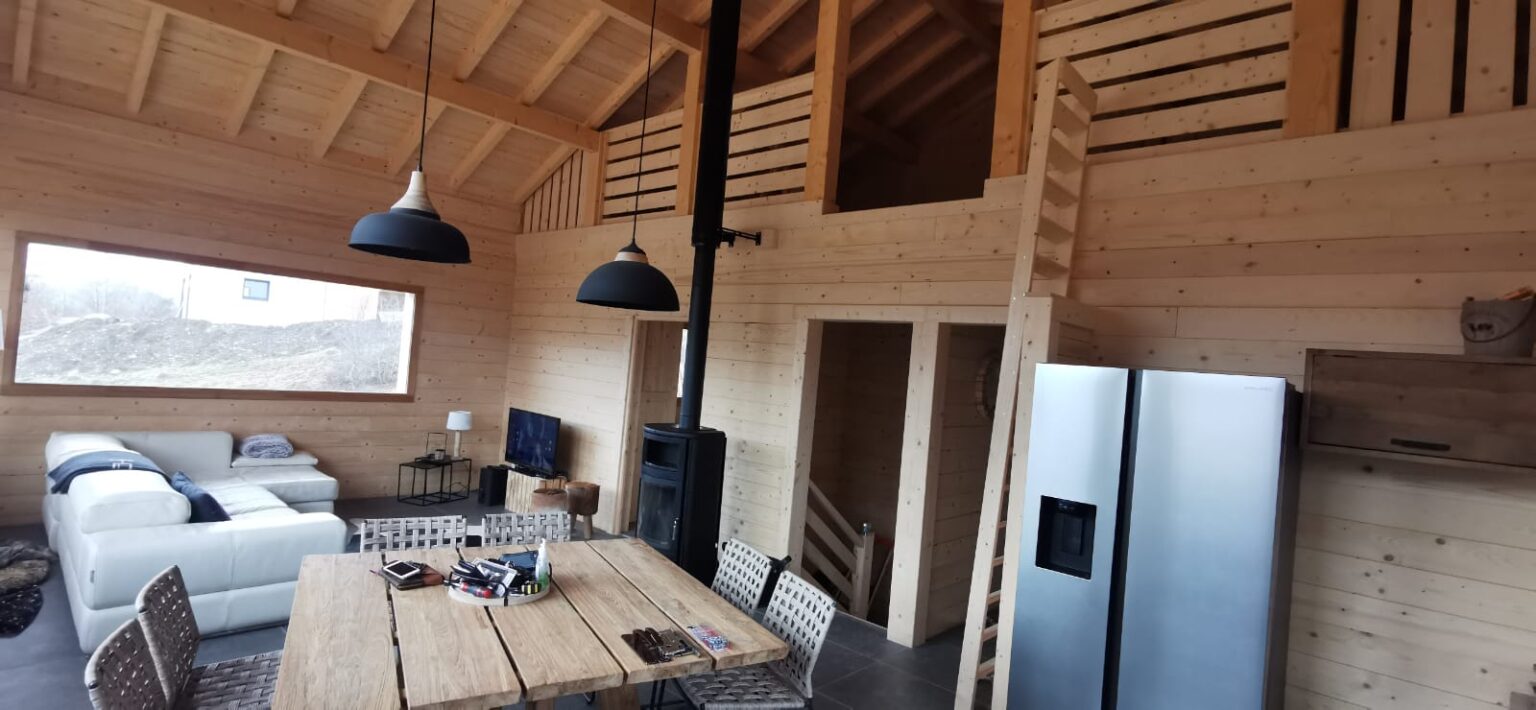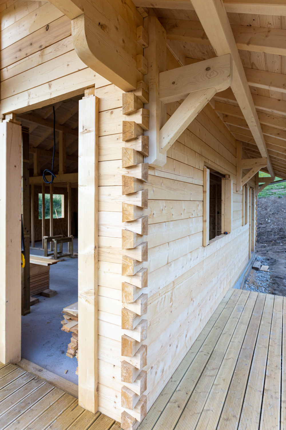 Cabana din lemn masiv, in grinzi dublu profilate de 100/200 mm, cu o suprafata de 81 m2, imbinare la colțuri în tehnica tradițională în „coadă de rândunică”.