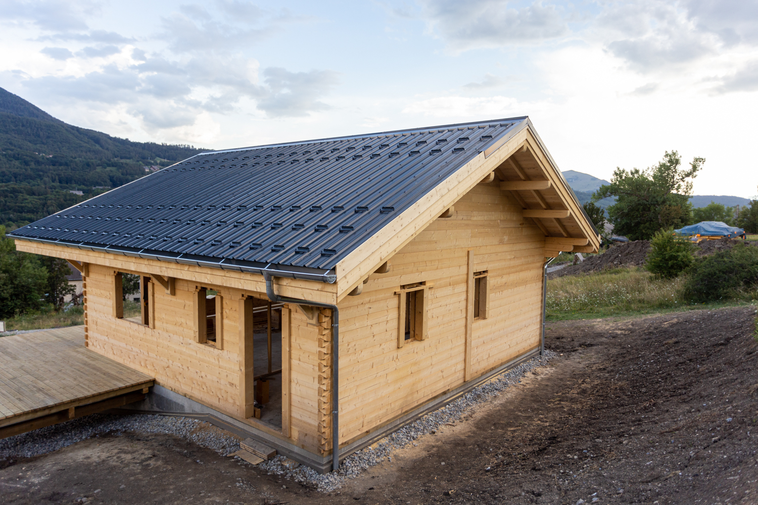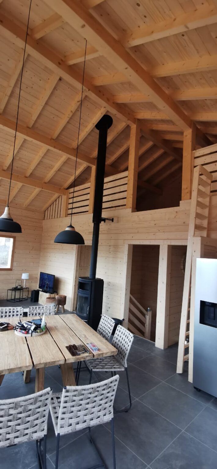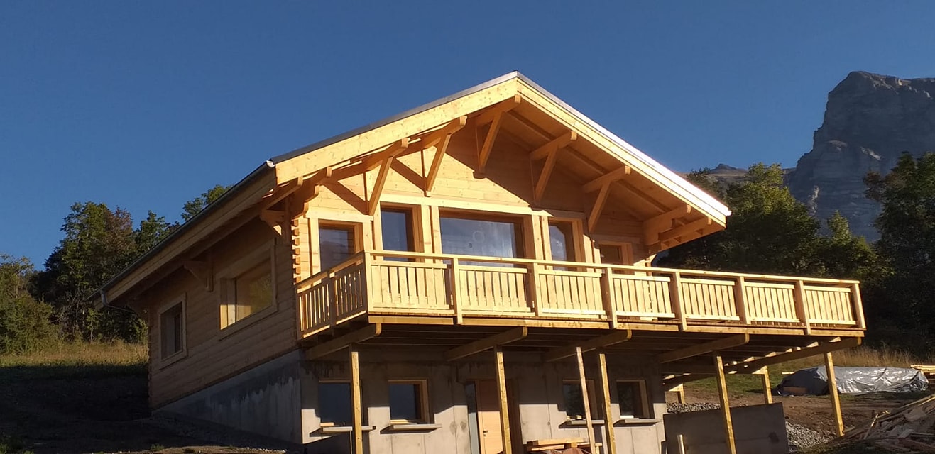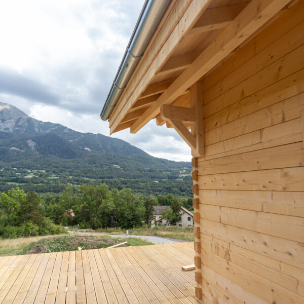 Cabana din lemn masiv, in grinzi dublu profilate de 100/200 mm, cu o suprafata de 81 m2, imbinare la colțuri în tehnica tradițională în „coadă de rândunică”.