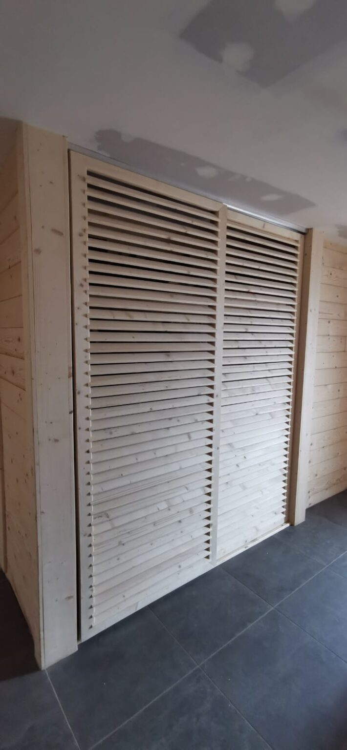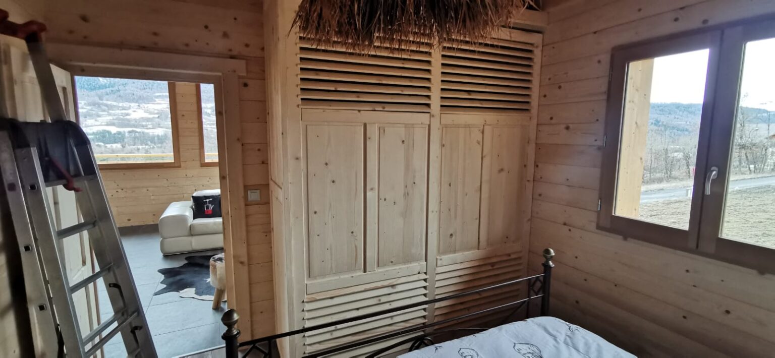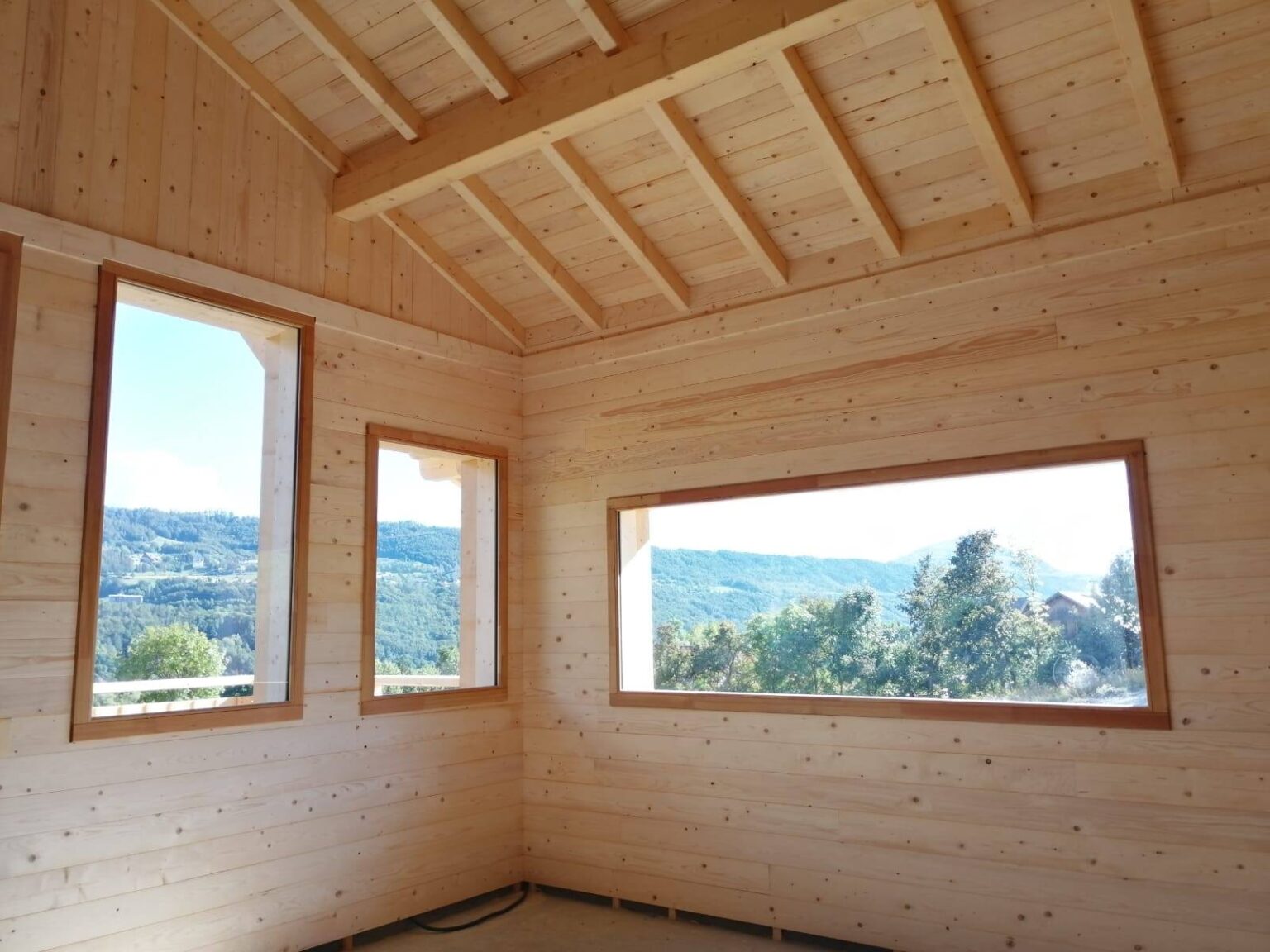 In realizarea a carei poze sunt expuse, beneficiarul a optat pentru un sistem pasiv de eficientizare energetica cu izolatie de 150 mm vata bazaltica, complementar spatiu capsulat aer grosime 50 mm, finisaj in lambriu interior grosime 21 mm, latime 150 mm, model #Podreg (asa cum se vede in pozele expuse). Acest sistem de pereti in structura hibrida genereaza o cabana eficienta energetic, insa face obiectul unui deviz complementar.