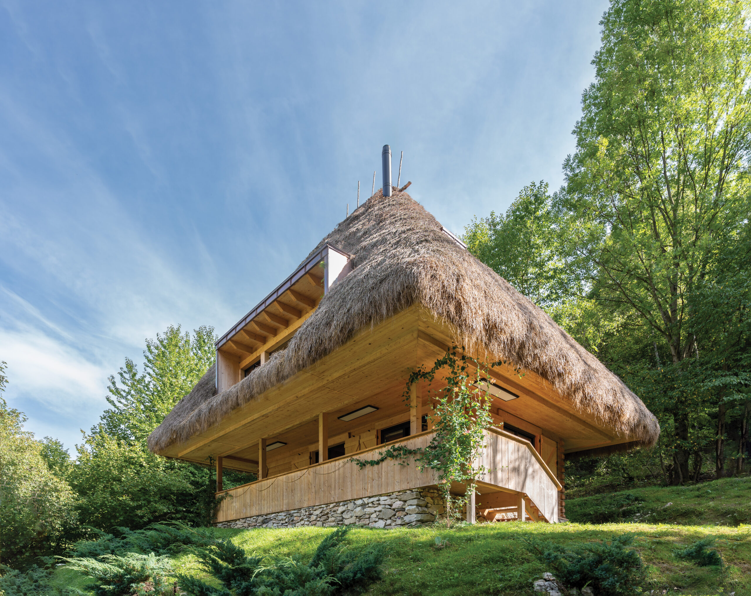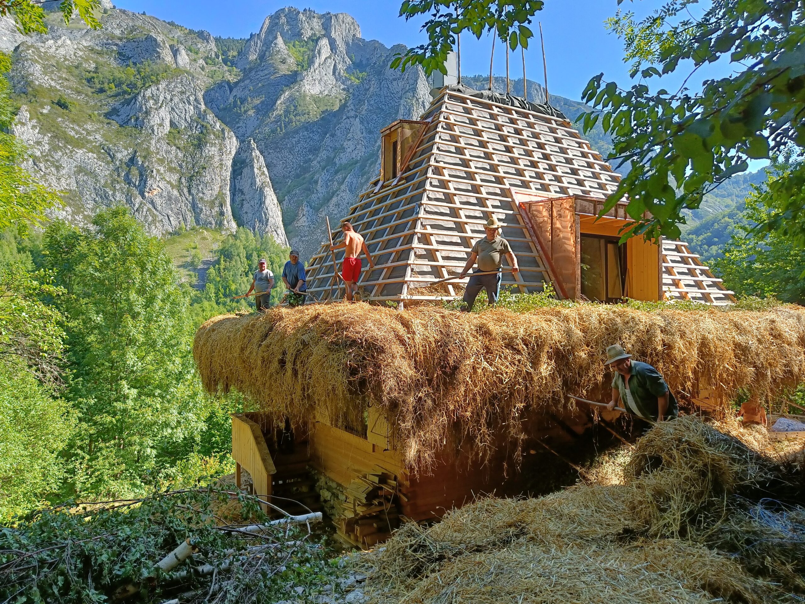 Acoperiș în patru ape, cu un unghi accentuat al șarpantei, conceput pentru evacuarea rapidă a apei și zăpezii, în combinație cu învelitoarea din paie.