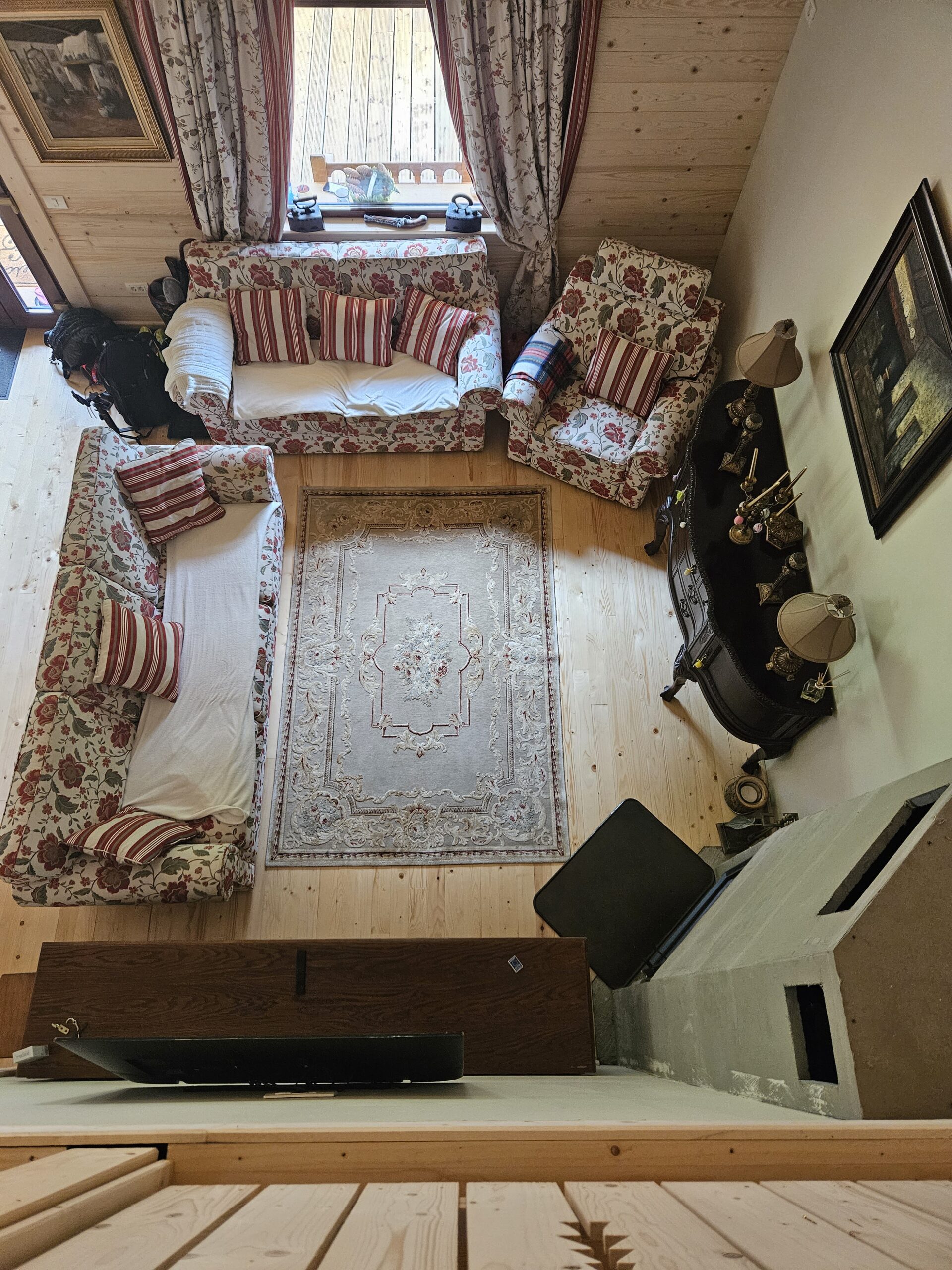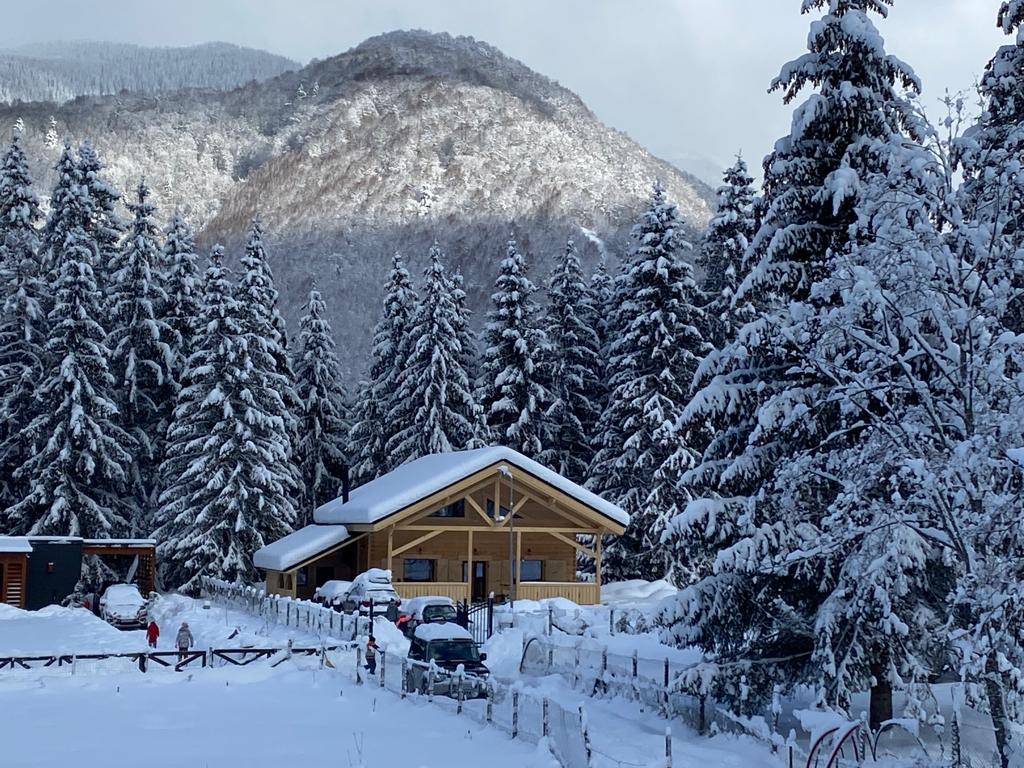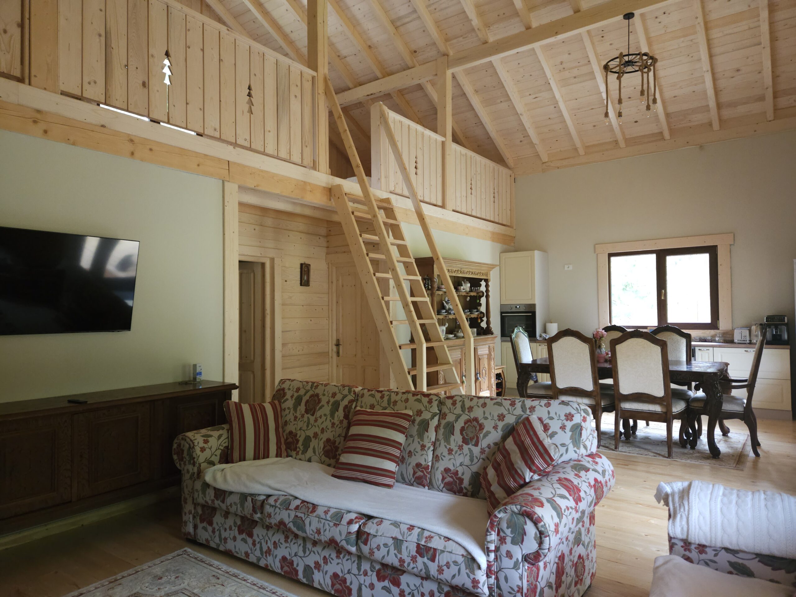 Cabană din lemn masiv esenta rasinoase, cu amprenta la sol 10×8,40 m, cu un vide-sejour generos deasupra spatiului de zi (sufragerie) si un mezanin de 27 m2. Cabana este organizata cu 2 dormitoare, mezaninul amenajat si el ca si spatiu de locuit, baie si WC, zonă de bucătărie și un living integrat.