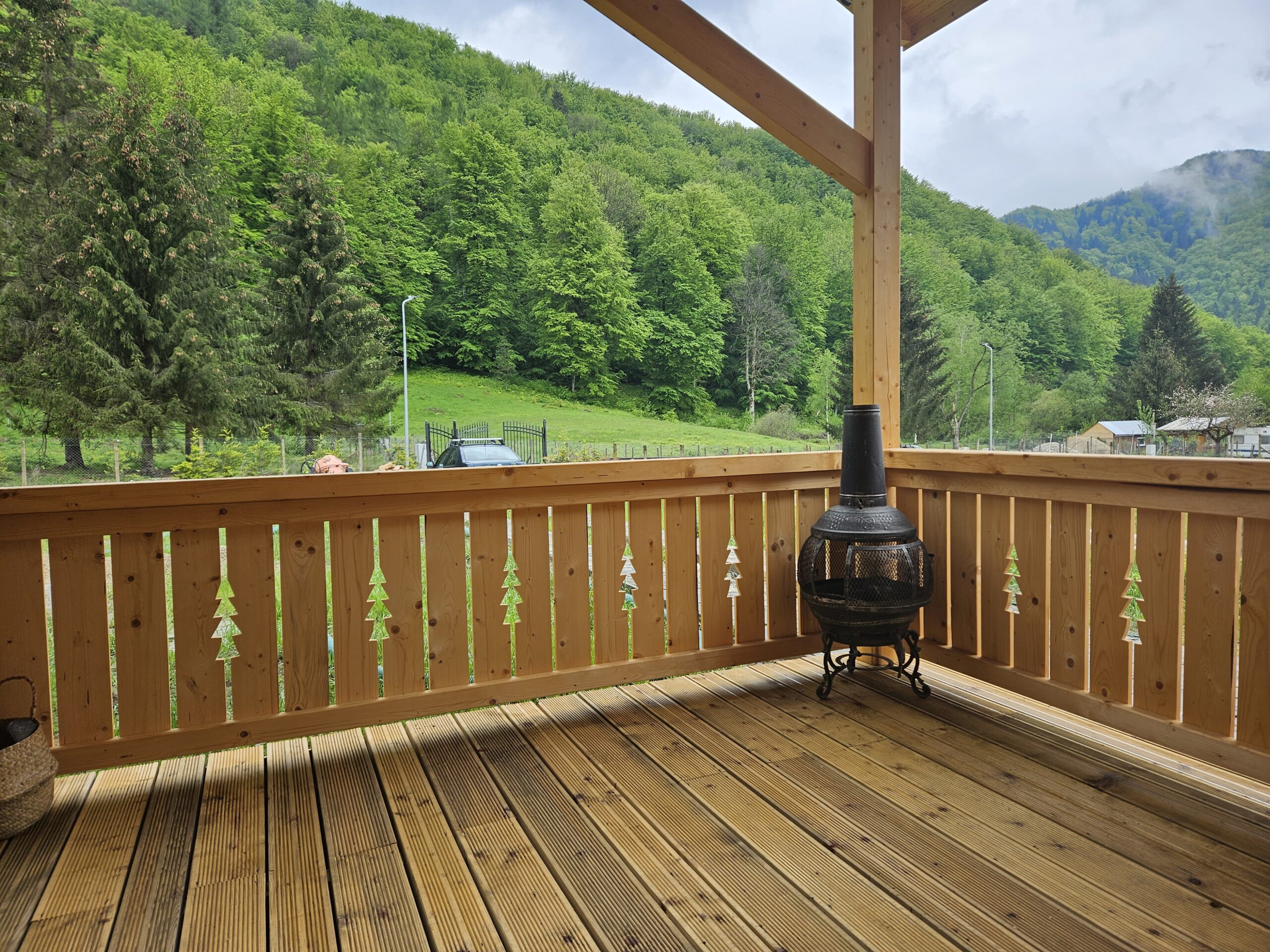 In pozele de mai sus este prezentata cabana cu terasa. In complement, se poate realiza si terasa care cuprinde acoperisul in continuarea cabanei, vedere interioara in lambriu rasinoase, stalpii 150/150 mm deck profilat antiderapant pe o parte si balustrada realizata cu mana curenta si elementi gard verticali 40/40 mm.